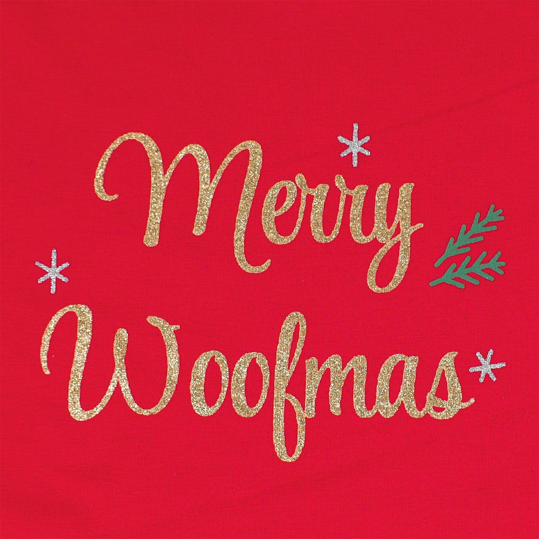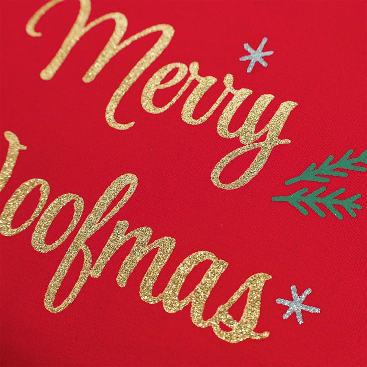 Red Woofmas dog dress graphic with glitter gold 'Merry Woofmas' text, silver snowflakes and pine sprigs.