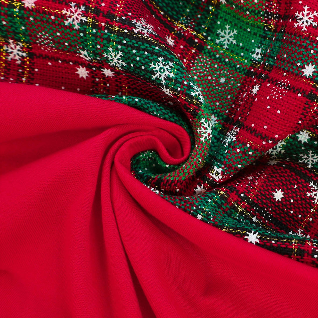 Close-up of red cotton dog dress fabric with festive green plaid pattern, white snowflakes, and gold glitter threads.