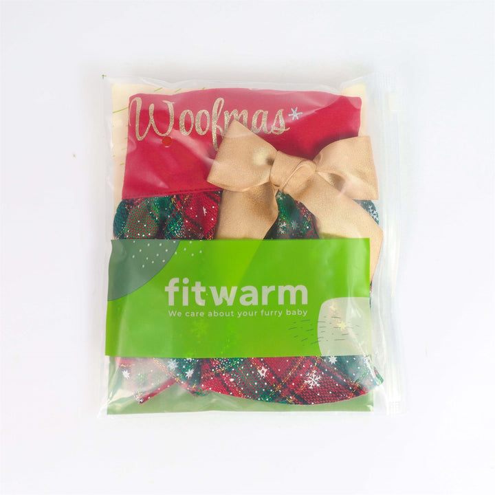 Red Woofmas dog dress with gold glitter text, plaid skirt, gold bow, snowflakes, folded in packaging.